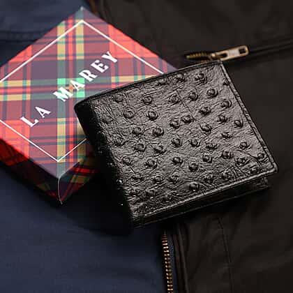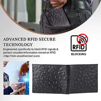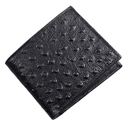 Genuine Leather Ostrich Embossed Bi Fold Mens Wallet (RFID Protected) - Ostrich Black