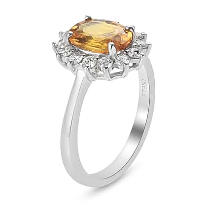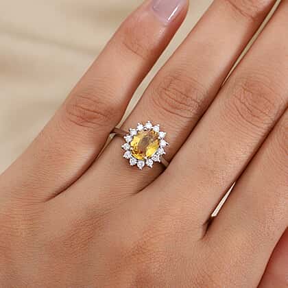 - STYLE AND SETTING: An oval cut Yellow Sapphire and round diamonds, form the halo design, with a weight of 3.05 Ct. A prong setting keeps the gemstones in place, elevating them to highlights their sheen and hues
