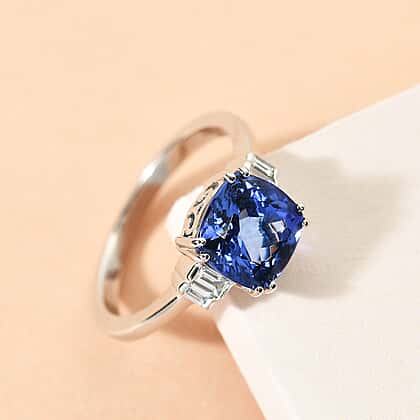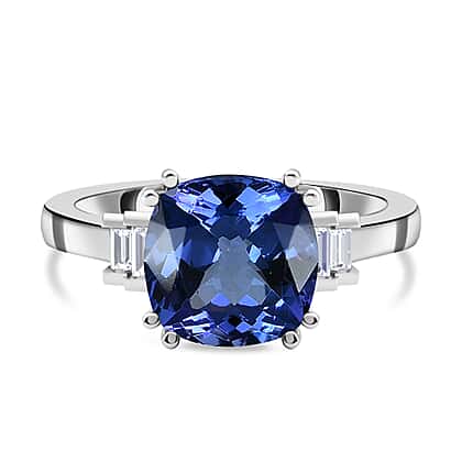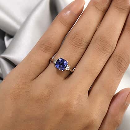 - DETAILED DESIGN: Tanzanite has been given a cushion faceted cut with 64 facets and offers a basic square shape with gently rounded corners, making the tanzanite look like a couch cushion. Double prongs have been used to make the tanzanite a lifetime part of this ring. The trapezoid-shaped baguette cut was formed on Diamonds by a Diamond alone, as only a diamond can cut a diamond and has been studded through bar setting onto the shoulders of the shank