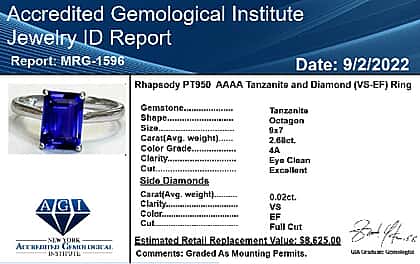 RHAPSODY 950 Platinum AGI Certified AAAA Tanzanite and Diamond (VS-E-F) Ring 2.70 Ct