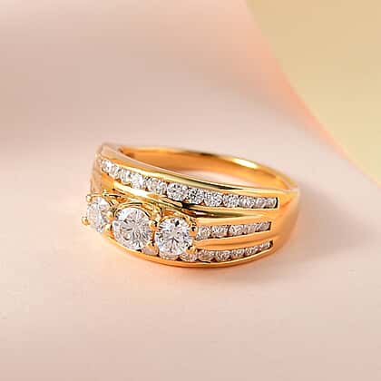 - This moissanite trilogy ring in sterling silver is plated with 18K vermeil yellow gold for enhanced appeal.