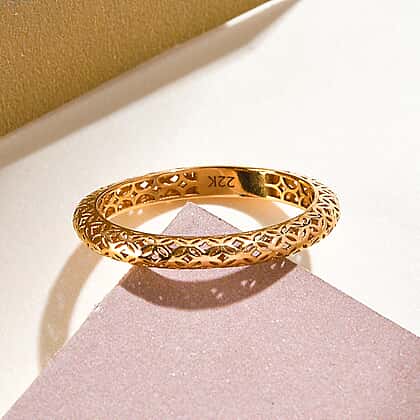 Raise a toast to a ceremonial occasion with this opulent Yellow Gold Band Ring. The ring flaunts a hollow tube design cast in the premium finish of gold. Intricate latticework on the ring speaks of extraordinary craftsmanship. 22K gold makes it an heirloom piece that never loses its sheen but continues to build on its present-day value. The flamboyant ring will pair well with traditional and formal dresses.
