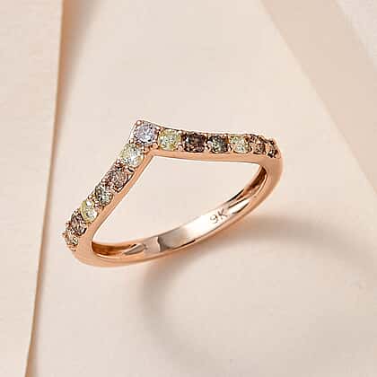 - A 9K rose gold ring featuring pink, champagne, and natural yellow diamonds.