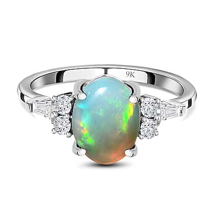 • Moissanite accents add a hint of sparkle to this 9K white gold ring featuring an AA Ethiopian opal.