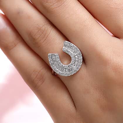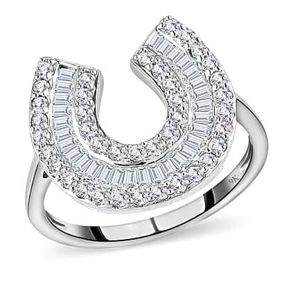 The elegant candour of white gold meets the unbridle dazzle of diamonds in this beautiful horseshoe ring. The diamond horseshoe ring has been crafted in white gold that mirrors the natural sparkle of the gleaming white gems in its polished finish. The diamonds paved to create a horseshoe design are certified by gem experts for excellent clarity and colour.