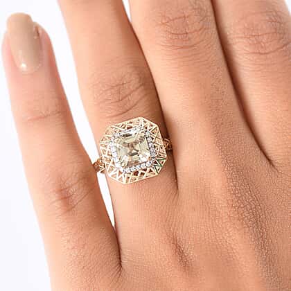 Introducing a masterpiece that captivates the heart and eyes, this mesmerising ring features an AA-grade turkizite gemstone at the heart of the piece, symbolising transformation and emotional healing. This ring features a beautiful halo of dazzling white diamonds surrounding the main stone, adding extra brilliance and shine. With its geometric design, it showcases true craftsmanship and artistry. Crafted in premium 9K yellow gold, this ring offers durability and a lavish finish. The hypoallergenic properties of the metal ensure safety and comfort for sensitive skin. The glossy finish makes the piece perfect for glamorous evenings and special gifting.