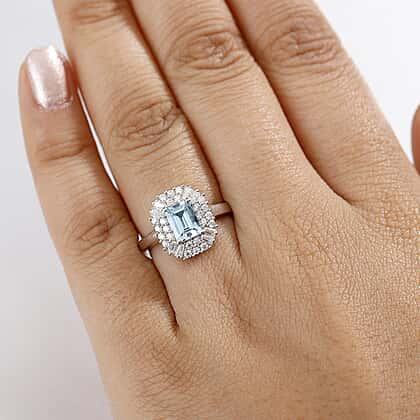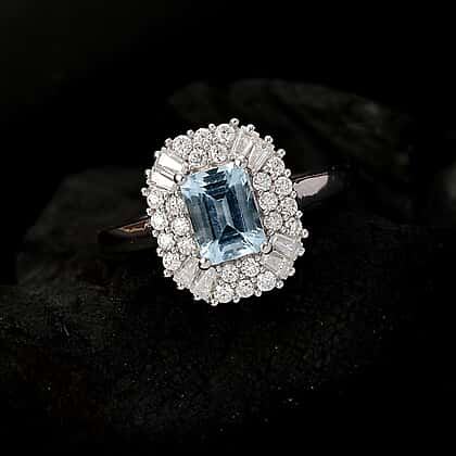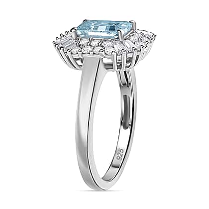 Aquamarine & Moissanite Ring in Rhodium Overlay Sterling Silver 1.54 Ct.