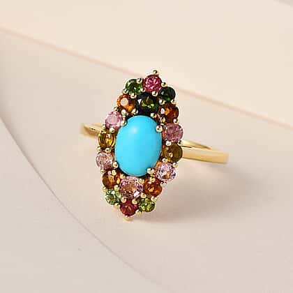 Arizona Sleeping Beauty Turquoise & Multi-Tourmaline Ring in 18K Yellow Gold Vermeil Plated Sterling Silver 2.04 Ct.