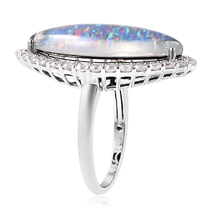 Australian Boulder Opal and Natural Cambodian Zircon Marquise (24x12mm) Ring in Rhodium Overlay Sterling Silver
