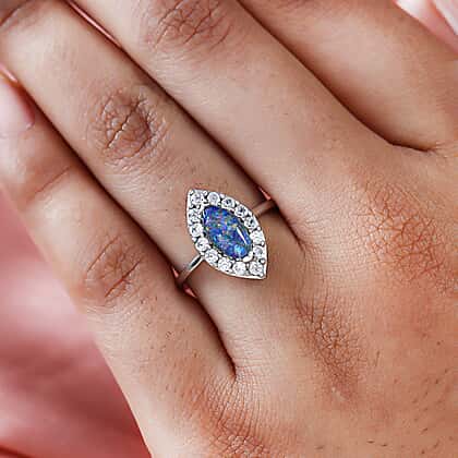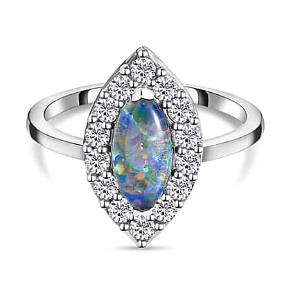 Australian Boulder Opal Triplet and Natural Cambodian Zircon Ring in Platinum Overlay Sterling Silver 1.60 Ct.