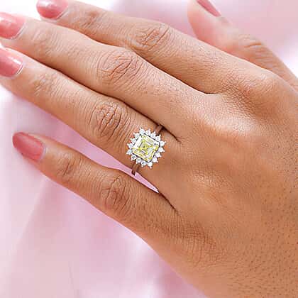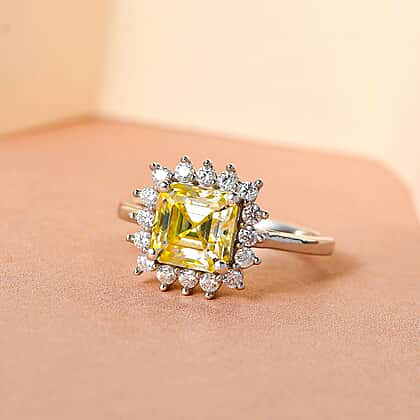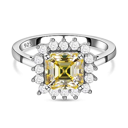 Canary Moissanite (Asscher Cut) and Moissanite Ring in Platinum Overlay Sterling Silver 2.07 Ct