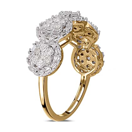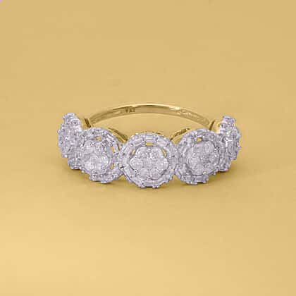 Flaunt elegance and superiority with this enchanting certified diamond ring in 9K yellow gold. The delicate artwork of this piece of jewel has been carried out by experienced artisans, providing it with a one-of-a-kind appeal. The five circular baskets at the top of the shank include 91 diamonds. Each comprises 1 round faceted centre stone packed with 5 round-faceted rocks on the inner boundary, and then the baguette cut covers the outer layer with shared prongs. The comfortable fit of this gold and diamond ring is easy to wear and makes it a personality-uplifting jewel. The ring features SGL certified diamond (I1-I2 /G-H), so you can flaunt the treasure with pride.