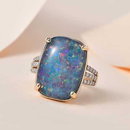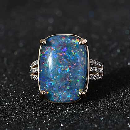Collectors Edition- 9K Yellow Gold Rare Size Australian Boulder Opal (Cushion 18x13 mm) & Moissanite Ring 9.34 Ct.