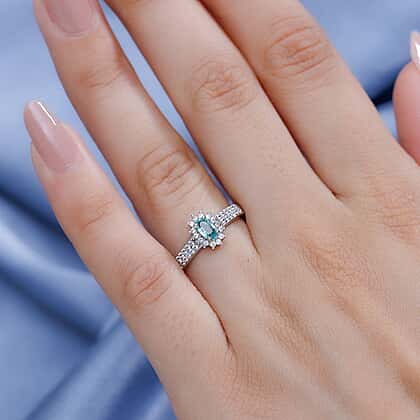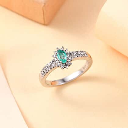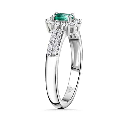 Colombian Emerald, White Zircon Halo Ring in Rhodium Overlay Sterling Silver