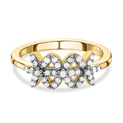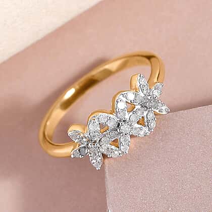 A floral motif adorns the ring, which features a straight shank. The ring's head comprises three flowery frames adorned with round single-cut diamonds. The frames are 18K Vermeil Gold plated sterling silver frames. A prong setting holds the diamonds firmly in place. As a trio, the flowery frames are set in a row. The diamond is studded in the centre like the pistil of a flower. Two diamonds are inserted in each floral petal.