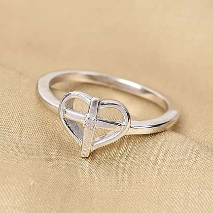 White Diamond Heart with Cross Ring in Platinum Overlay Sterling Silver
