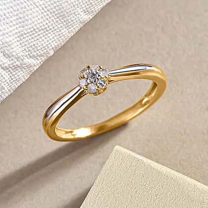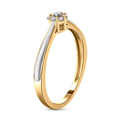 The floral design seven diamond ring in vibrant tones of 18K Yellow Gold and Rhodium will quickly turn you into a ring devotee. The ring's jewel weighs 0.100 Ct. and is held in place by four prongs. Floral rings will never go out of style, regardless of fashion trends. The ring weighs 1.500 grammes and is constructed of Vermeil 18K Yellow Gold and Rhodium. It has a flair for a vivid oink tint that draws attention to the ring.
