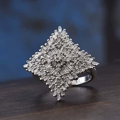 1 Carat Diamond Cluster Ring in Platinum Plated Sterling Silver 5.38 Grams