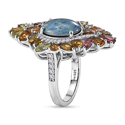 D'Joy - Boulder Opal Triplet, White Zircon & Multi-Tourmaline Cluster Ring in Rhodium Overlay Sterling Silver 6.70 Ct.