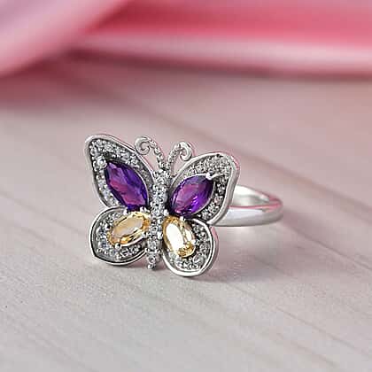 D'Joy African Amethyst, Citrine & White Zircon Cluster Butterfly Ring in Rhodium Overlay Sterling Silver 1.58 Ct.