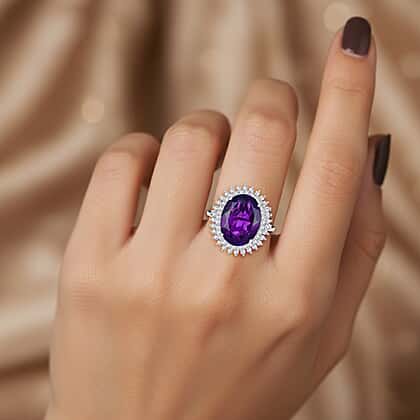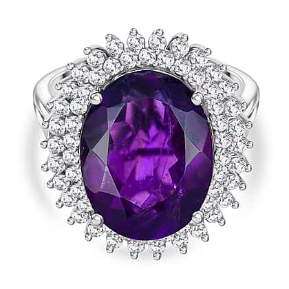 D'Joy 8.5 Ct. African Amethyst, White Zircon Double Halo Ring in Rhodium Overlay Sterling Silver
