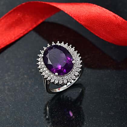 D'Joy African Amethyst & White Zircon Ring in Rhodium Overlay Sterling Silver 9.82 Ct.