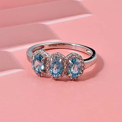 A graceful trio of sparkle shapes this blue zircon, white zircon trilogy ring. Laced with a halo of white zircons, this sparkling ring features a trio of oval-shaped blue zircons in a four-prong setting, exuding light blue hues. Blue zircon is prized for its bright colour, giving the centre stone a vivid impact. White zircon on either side adds crisp brilliance to the centrepiece. The trilogy layout symbolises past, present and future, making it a meaningful choice. Made of rhodium‑plated sterling silver, this ring is hypoallergenic, tarnish‑resistant and won’t turn green. Choose this ring when you want vibrant colour combined with symbolism and a beautifully polished finish.