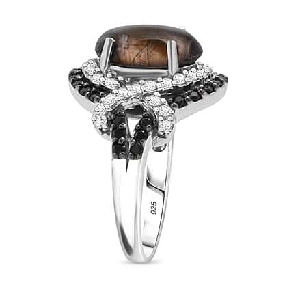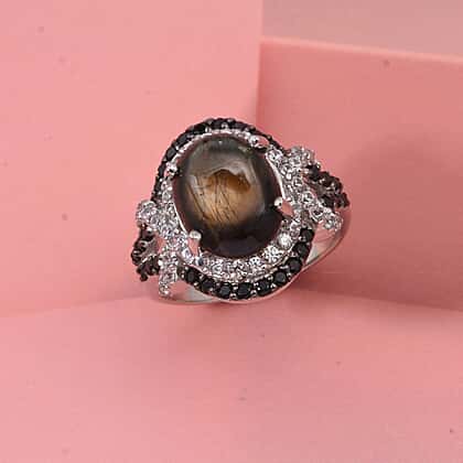 D'Joy Chantaburi Black Star Sapphire, Black Spinel & Natural Zircon Ring in Rhodium Overlay Sterling Silver 10.26 Ct.
