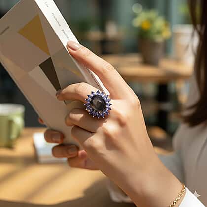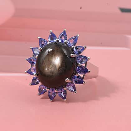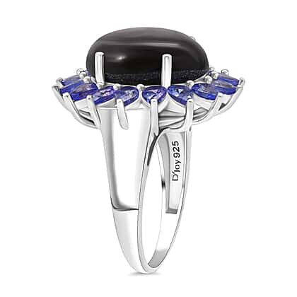 D'Joy Chantaburi Black Star Sapphire & Tanzanite Ring in Rhodium Overlay Sterling Silver 17.66 Ct.