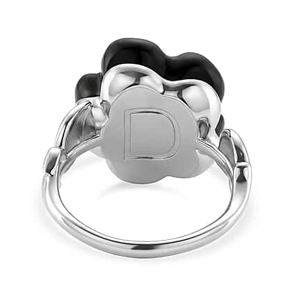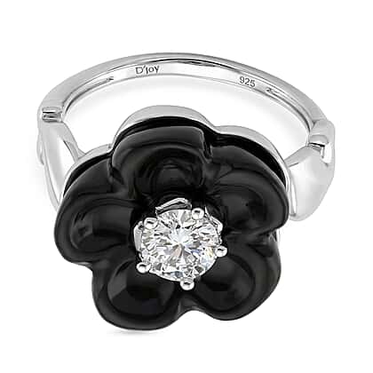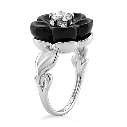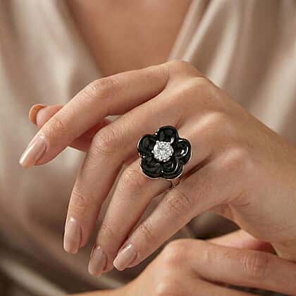 D'Joy Dyed Black Jade Flower & Lab Grown Diamond Ring in Rhodium Overlay Sterling Silver 15.50 Ct.