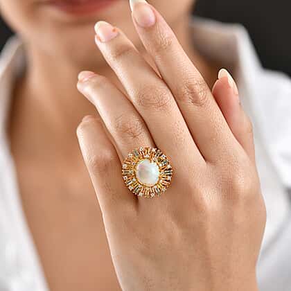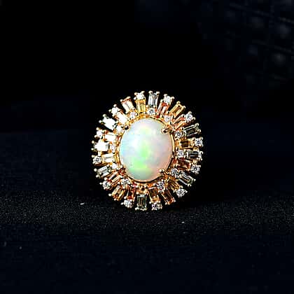 D'Joy Ethiopian Opal, Multi Sapphire & Moissanite Main Stone with Surrounding Stone Ring in 18K Vermeil Yellow Gold Plated Sterling Silver 5.71 Ct.