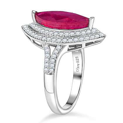 D'Joy Fissure Filled Natural Ruby, Moissanite Halo Ring in Rhodium Overlay Sterling Silver 4.78 Ct.