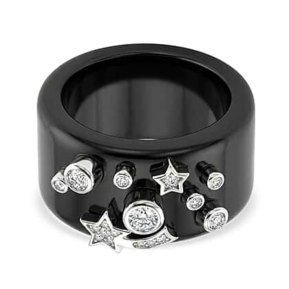 Give into celestial jewellery magic and mystery by adorning your finger with this D'Joy moissanite and black jade ring. Dark and dreamy, this celestial-inspired band is made with black jade. The smooth, high-gloss band forms a striking canvas for scattered moissanite accents that shimmer like stars against a midnight sky. Tiny star motifs and brilliant round stones are set in rhodium overlay sterling silver, creating a constellation effect that feels both mystical and modern. The contrast between inky black jade and radiant sparkle is bold yet beautifully balanced. This bold moissanite ring can signify guidance, hope, and infinite possibilities. This black jade ring can inspire the wearer to always reach for the stars!