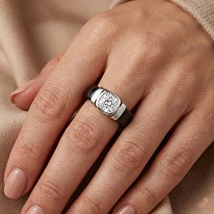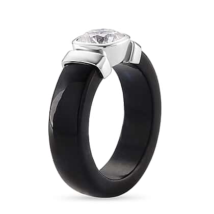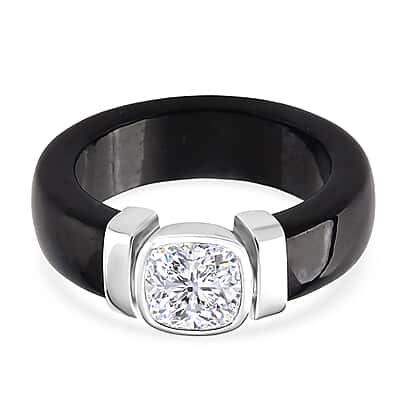 D'Joy Moissanite & Dyed Black Jade GRA Certified Solitaire Band Ring in Rhodium Overlay Sterling Silver 29.70 Ct.