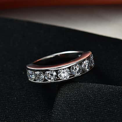 Enhance your look with this moissanite half eternity band ring, designed to deliver continuous sparkle with a clean and structured finish. A row of precisely set stones runs across the front of the band, creating a bright, light-catching effect that adds brilliance without overwhelming the design. Moisaanite is known for its captivating shine and brilliance, resembling natural diamonds. The smooth metal surface complements the stones, giving the ring a balanced and polished appearance. Expertly designed in platinum overlay on 925 sterling silver, this ring offers lasting shine and luxurious appeal. Its half eternity style offers both visual impact and everyday comfort, making it easy to wear throughout the day. Combining shine with simplicity, this ring is a versatile addition to any jewellery collection.