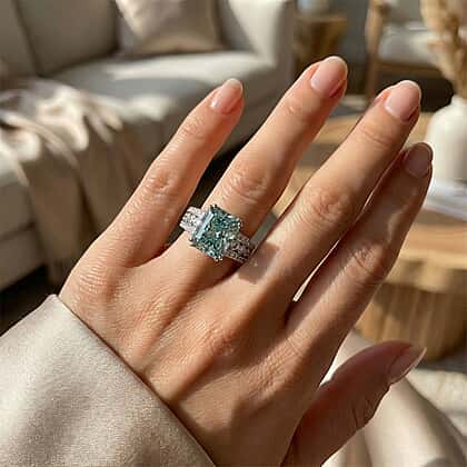 D'Joy Paraiba Moissanite Main Stone With Side Stone Ring in Rhodium OverlaySterling Silver 3.140 Ct.