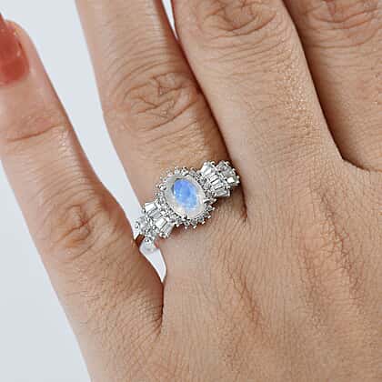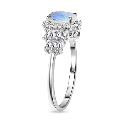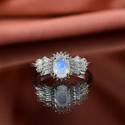 D'joy Rainbow Moonstone & White Zircon Ring in Rhodium Overlay Sterling Silver 2.08 Ct.