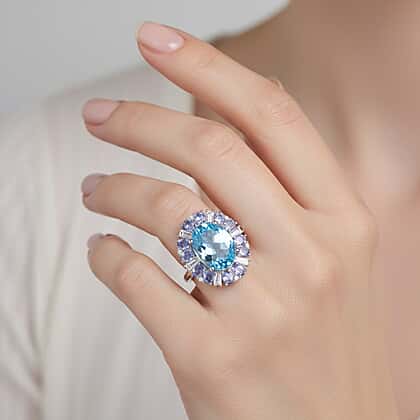 D'Joy Swiss Blue Topaz, Moissanite & Tanzanite Ring in Rhodium Overlay Sterling Silver 9.43 Ct.