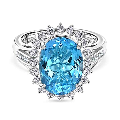 D'Joy Swiss Blue Topaz & White Zircon Halo Ring in Rhodium Overlay Sterling Silver 7.55 Ct.