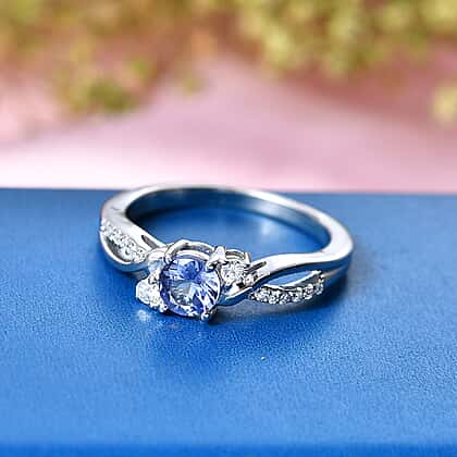 D'Joy Tanzanite, Moissanite Main Stone With Side Stone Ring in Rhodium OverlaySterling Silver 0.615 Ct.