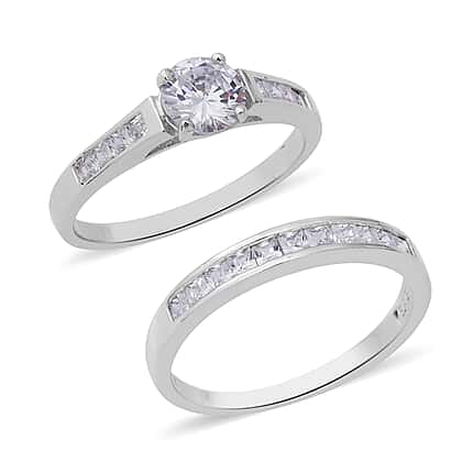 Set of 2 ELANZA Simulated Diamond Solitaire Band Ring in Rhodium Plated Sterling Silver