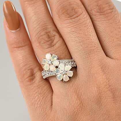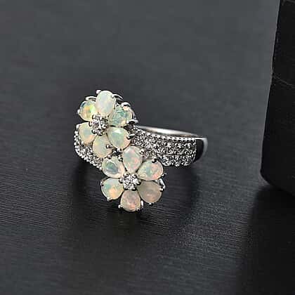 Ethiopian Faceted Opal, White Zircon Floral Bypass Ring in Rhodium Overlay Sterling Silver