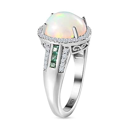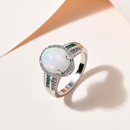 Ethiopian Welo Opal, Zambian Emerald and Natural Zircon Ring in Platinum Overlay Sterling Silver 3.18 Ct.
