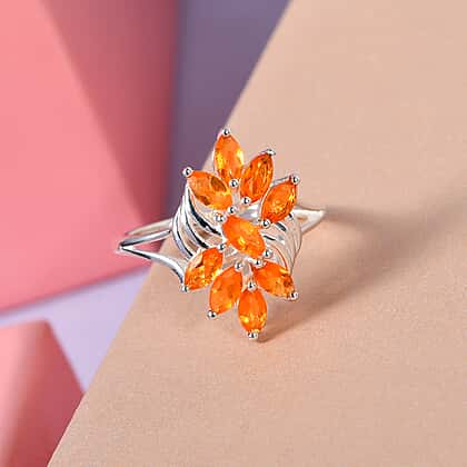 The floral theme inspires the design of this fire opal cluster ring. It is decorated with marquise shape opals prong set in the frame, exhibiting bright orange hues forming a cluster pattern on the frame. This alluring ring is made from sterling silver with a split shank design to add a luxe appeal. You can style it with a fire opal pendant to grace your outfit.