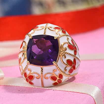 GP 5.28 Ct Amethyst and Blue Sapphire Enamelled Solitaire Ring in 14K Gold Plated Sterling Silver