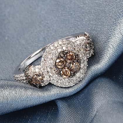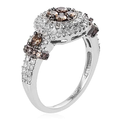 GP Champagne and White Diamond, Blue Sapphire Ring in Platinum Overlay Sterling Silver 1.02 Ct.