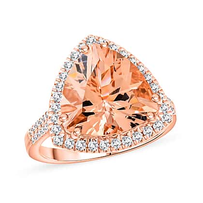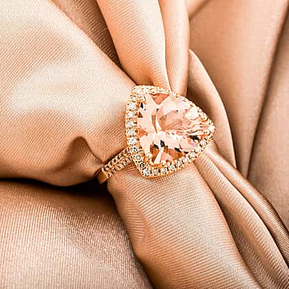 The Luxoro 10K Rose Gold AAA Morganite, White Diamond Halo Ring captivates with a striking 12mm trillion-cut Morganite, flaunting a warm peach-pink hue. Its precision cut and eye-clean clarity allow for exceptional light reflection. A halo of full-cut White Diamonds garlands the morganite, adding an irresistible sparkle. The unique trillion cut lends the design a modern yet graceful presence, while the 10K rose gold setting envelops the ring in a soft, romantic glow.