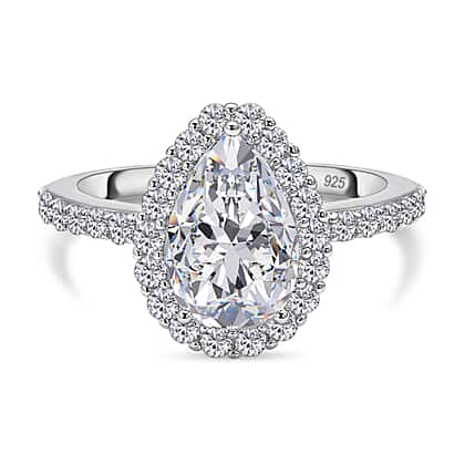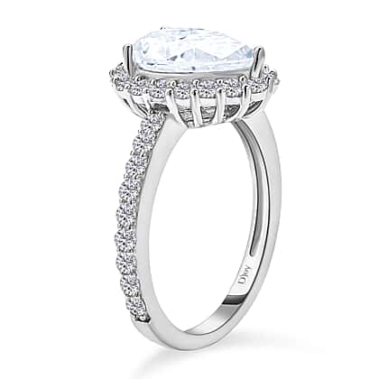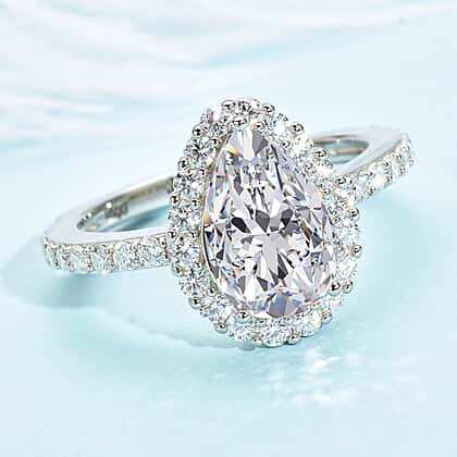Moissanite Tear Drop Halo Ring in Rhodium Plated Sterling Silver 3.71 Ct.