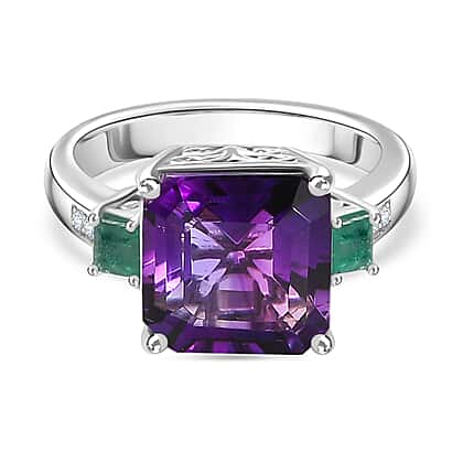 Moroccan Amethyst, Emerald, and Moissanite Solitaire Ring in Rhodium Overlay Sterling Silver, 4.966 Ct.