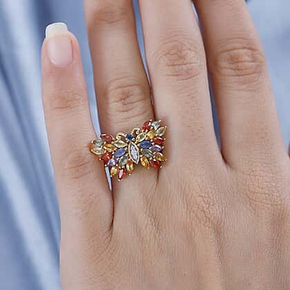 Multi Sapphire, Natural Zircon Marquee Ring in 18K Vermeil Plated Sterling Silver 2.66 Ct